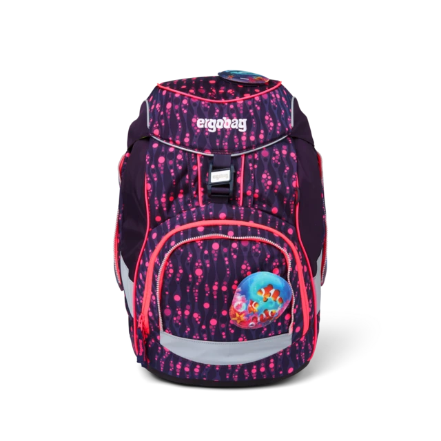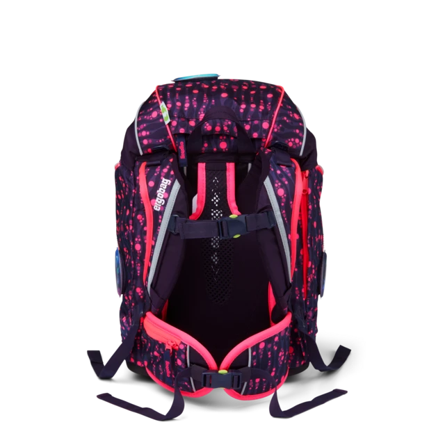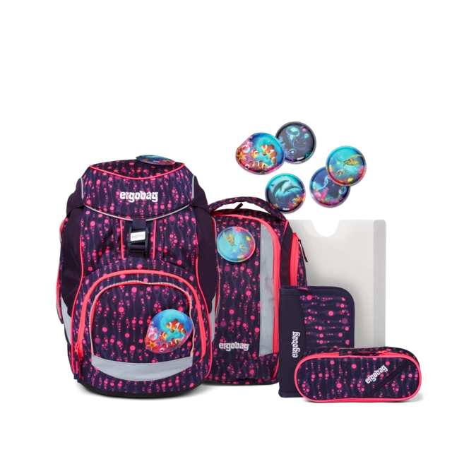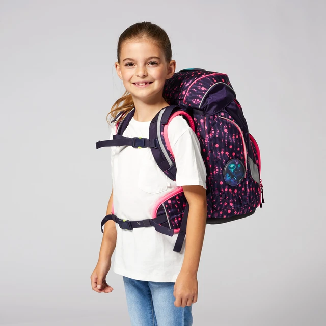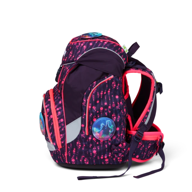 The school backpack with the ergonomic >>Your-Size-System<< has a modern, flexible shape. The entire content can be compressed with the drawstring. A notebook box is included in the set to protect against dog-ears. The buckle can be opened by sliding it to the side.