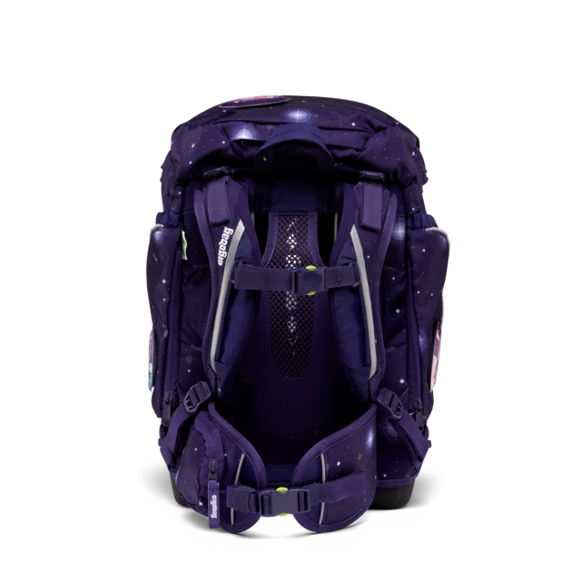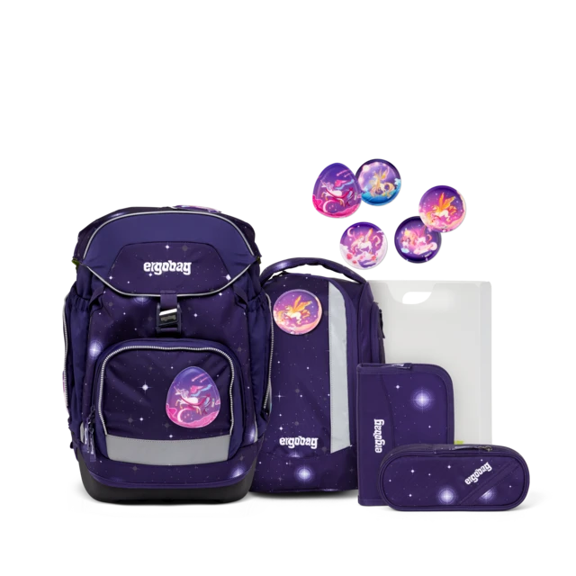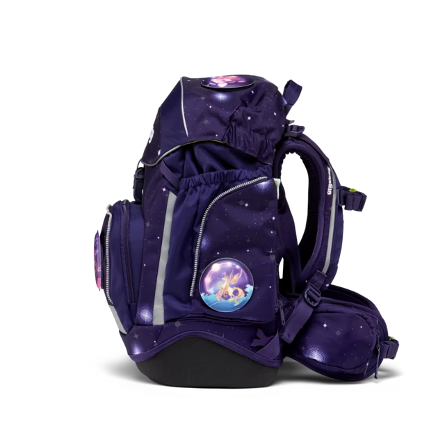 The school backpack with the ergonomic >>Your-Size-System<< has a modern, flexible shape. The entire content can be compressed with the drawstring. A notebook box is included in the set to protect against dog-ears. The buckle can be opened by sliding it to the side.