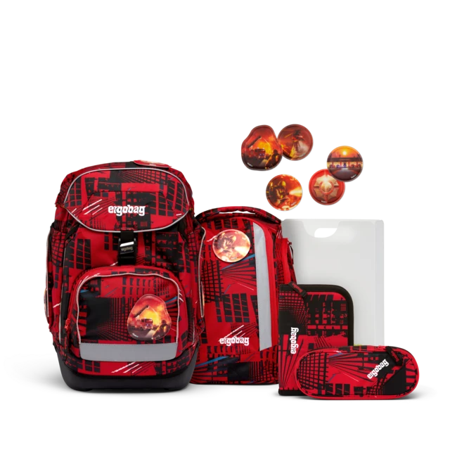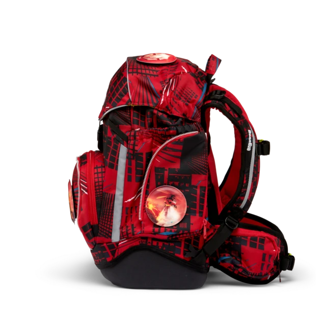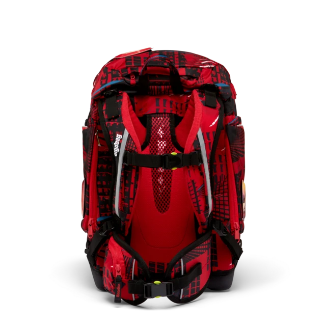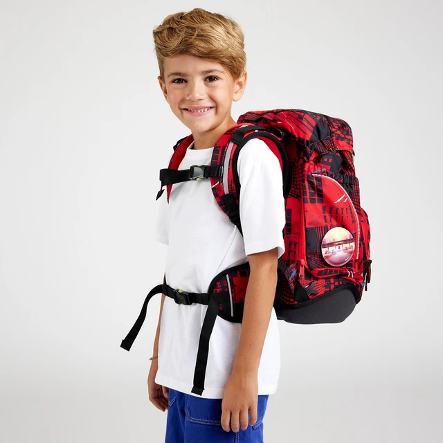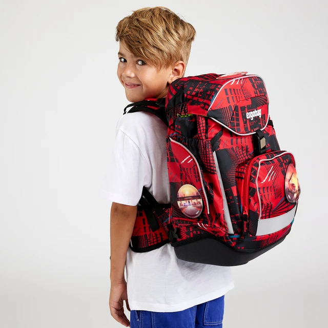 The school backpack with the ergonomic >>Your-Size-System<< has a modern, flexible shape. The entire content can be compressed with the drawstring. A notebook box is included in the set to protect against dog-ears. The buckle can be opened by sliding it to the side.