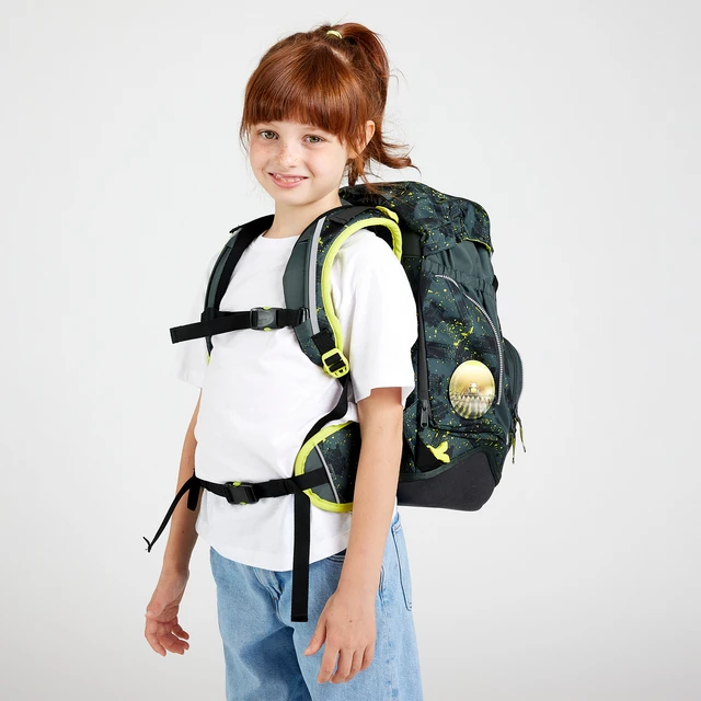 The school backpack with the ergonomic >>Your-Size-System<< has a modern, flexible shape. The entire content can be compressed with the drawstring. A notebook box is included in the set to protect against dog-ears. The buckle can be opened by sliding it to the side.