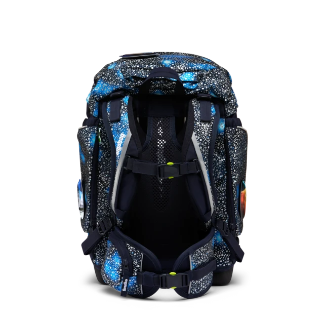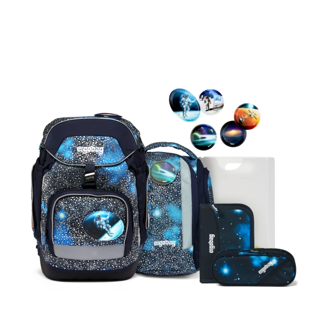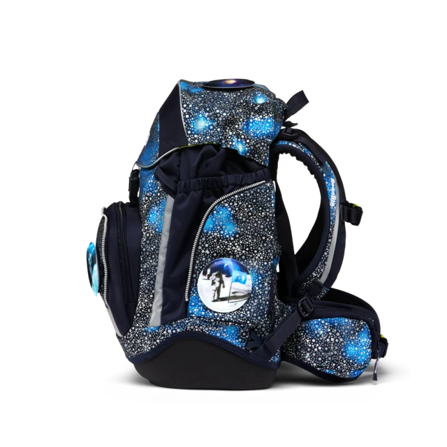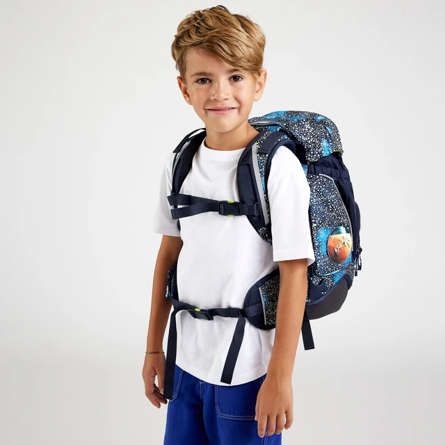 The school backpack with the ergonomic >>Your-Size-System<< has a modern, flexible shape. The entire content can be compressed with the drawstring. A notebook box is included in the set to protect against dog-ears. The buckle can be opened by sliding it to the side.