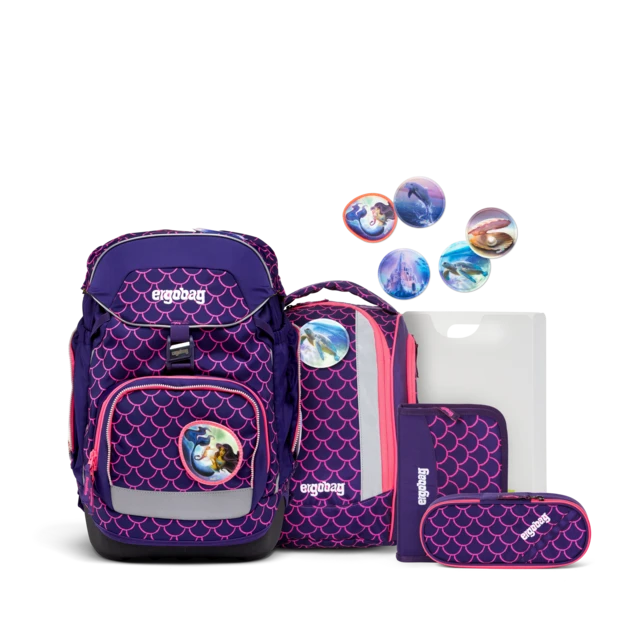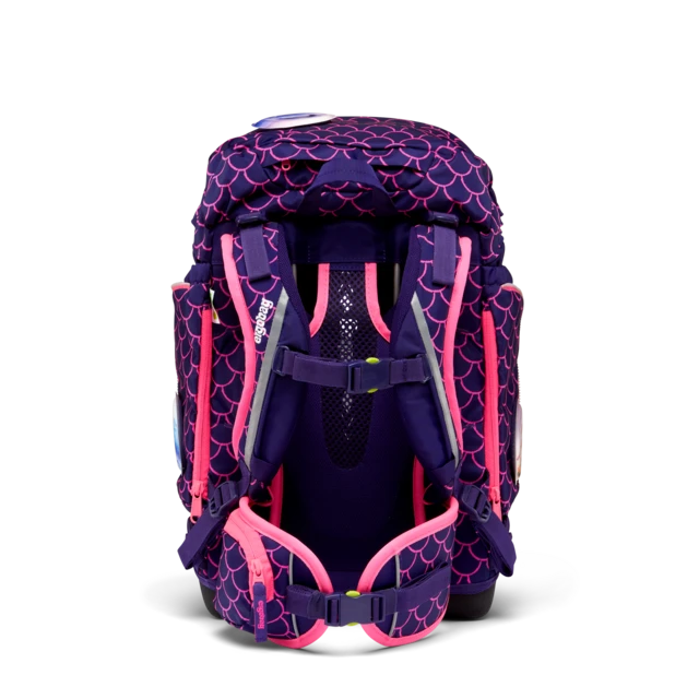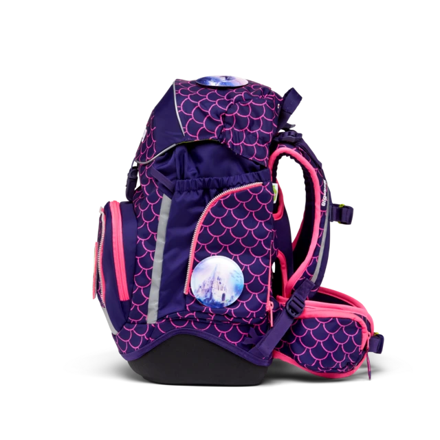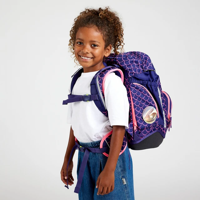 The school backpack with the ergonomic >>Your-Size-System<< has a modern, flexible shape. The entire content can be compressed with the drawstring. A notebook box is included in the set to protect against dog-ears. The buckle can be opened by sliding it to the side.