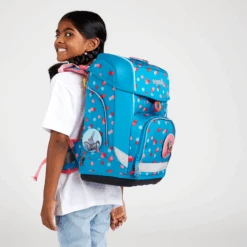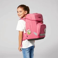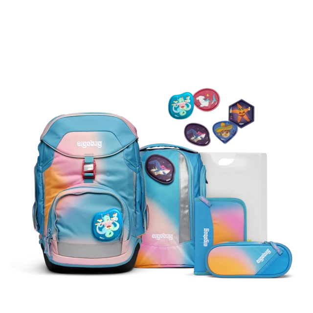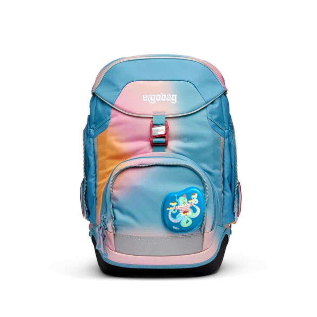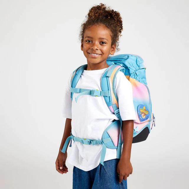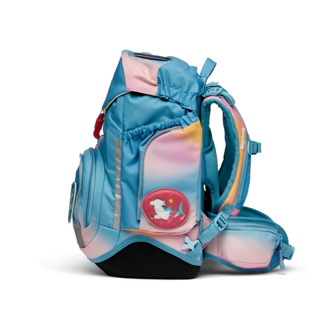 The school backpack with the ergonomic >>Your-Size-System<< has a modern, flexible shape. The entire content can be compressed with the drawstring. A notebook box is included in the set to protect against dog-ears. The buckle can be opened by sliding it to the side.